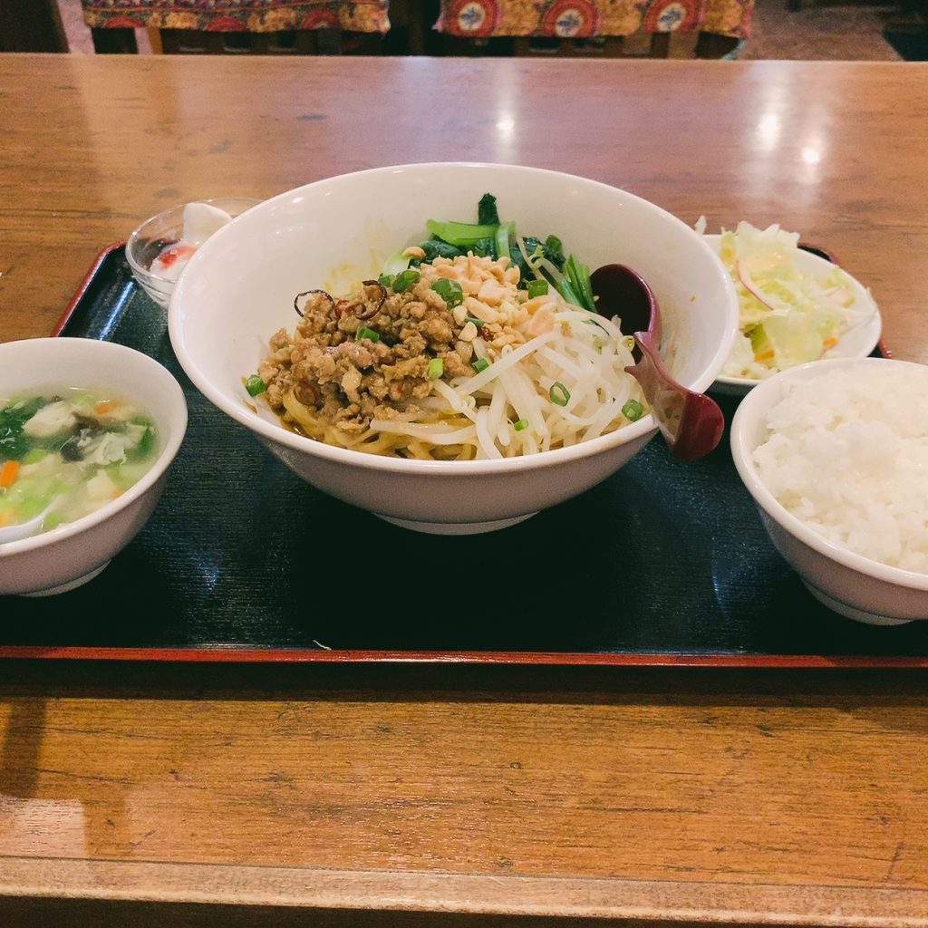 担々麺の他にごはん、スープ、サラダ、デザートのフルセットがついています。