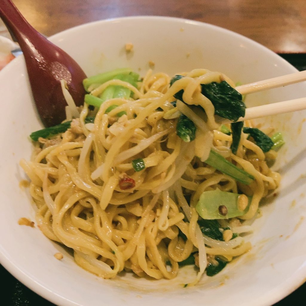 汁なし担々麺には、もやし、ひき肉、ほうれん草、ナッツがトッピングされており、かなりジューシーな感じでした。