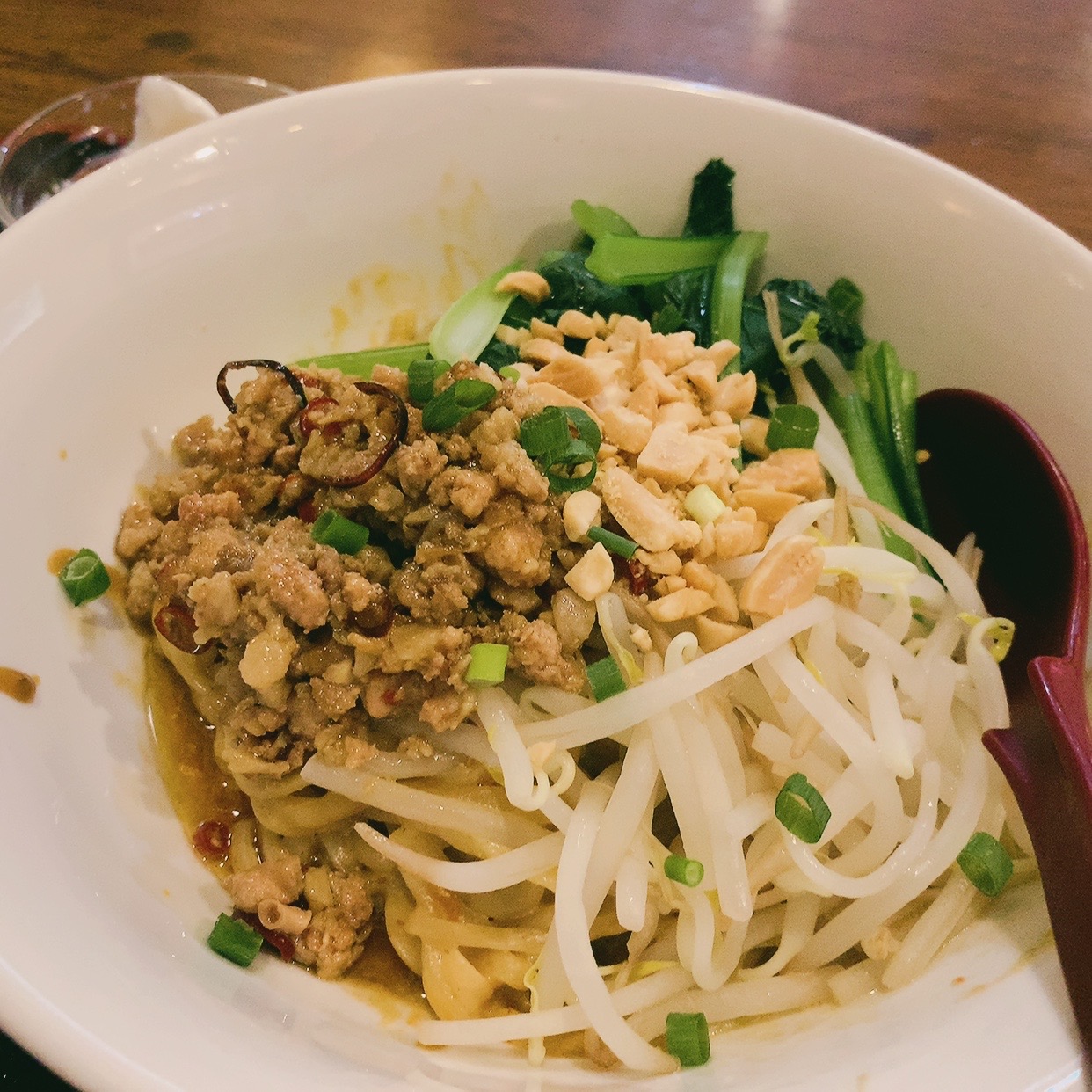 汁なし担々麺には、もやし、ひき肉、ほうれん草、ナッツがトッピングされており、かなりジューシーな感じでした。