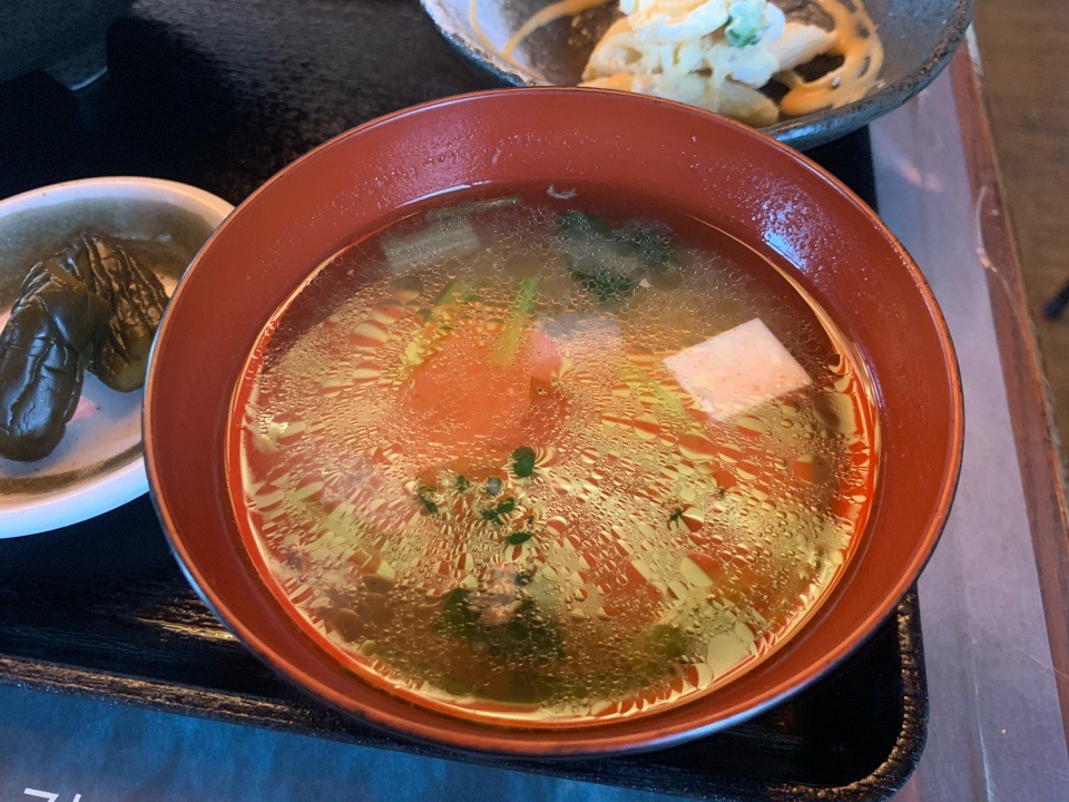 豆腐や大根、ほうれん草など具沢山のお味噌汁で栄養もあり、ごはんとお味噌汁、香の物だけでもお腹一杯になります。