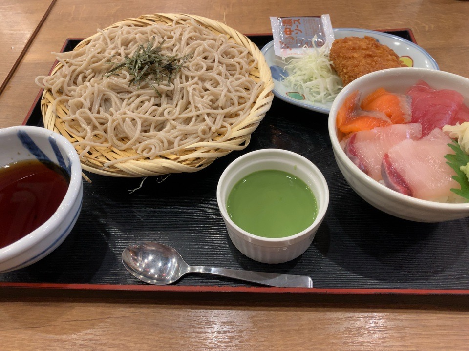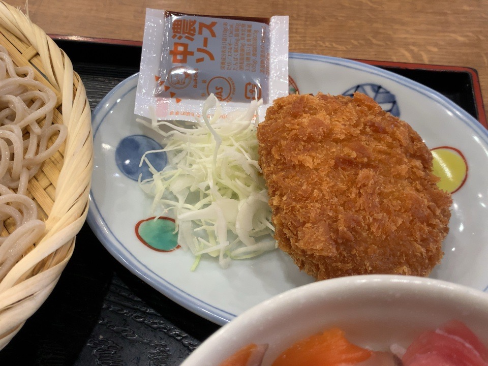 そば、海鮮3色丼、コロッケ、デザートが付いてます。