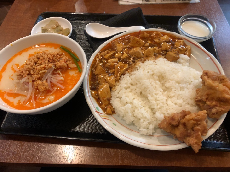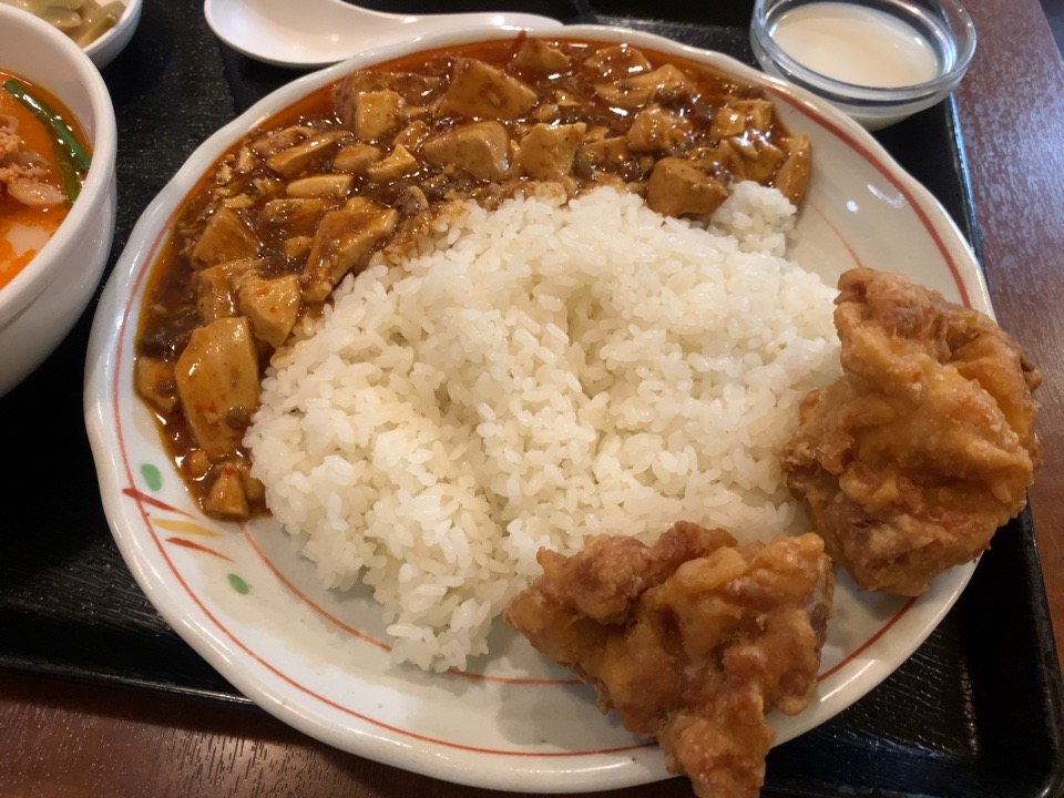 こちらが、マーボー丼+唐揚げ+半刀削麺です。
