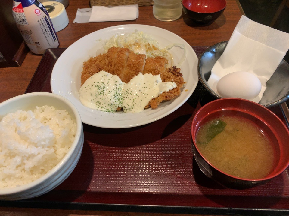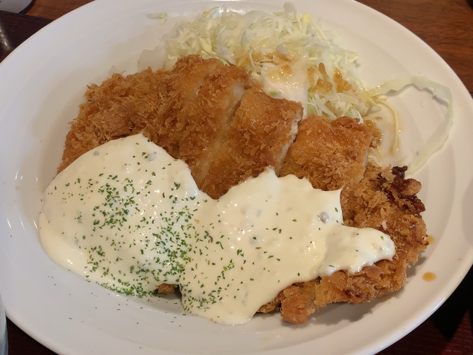 外はサクサク、中はジューシーなチキンカツに特製のタルタルソースがかかっています。