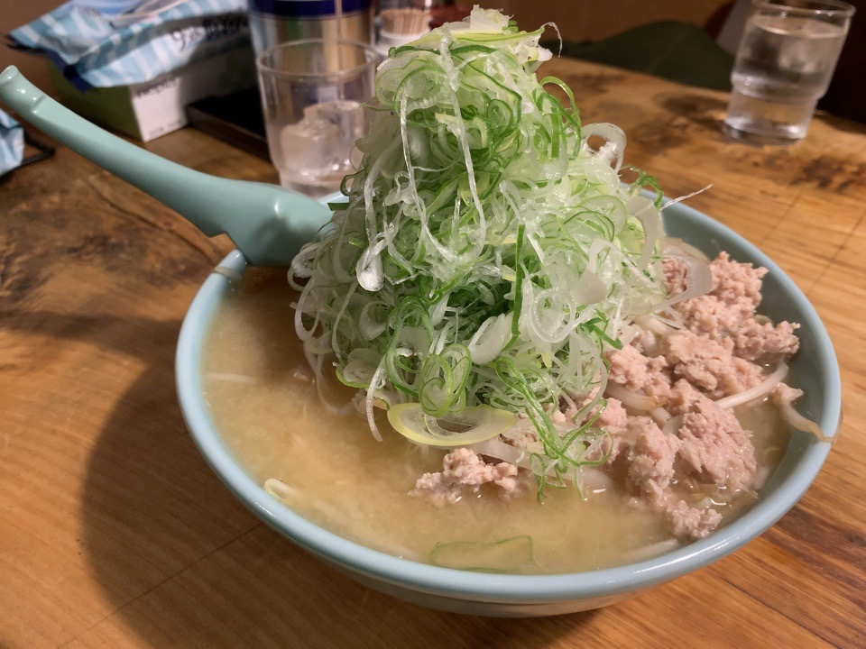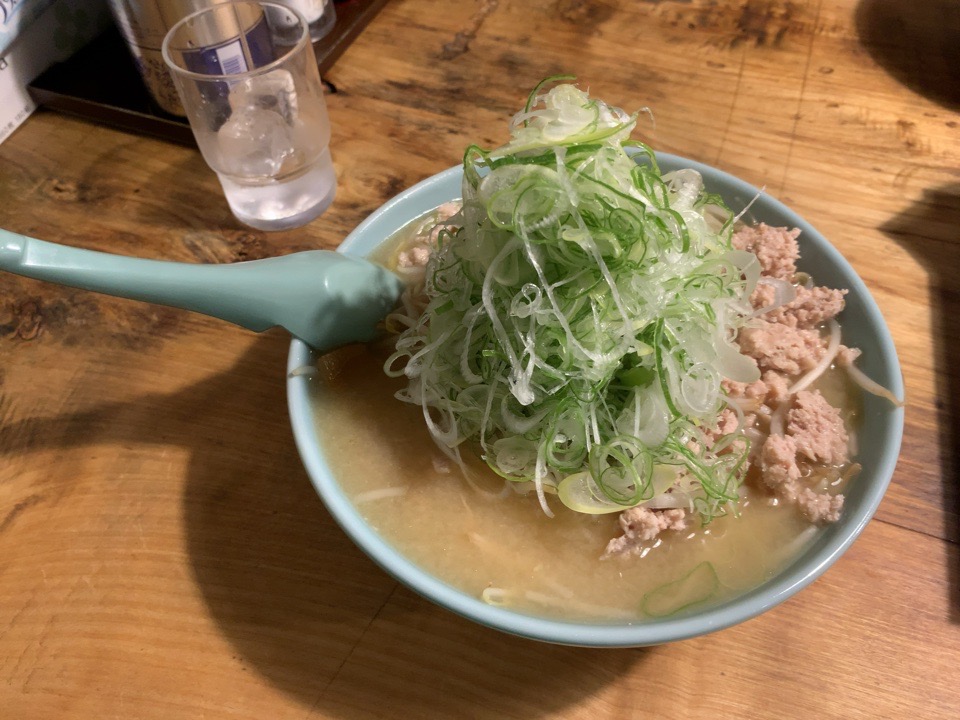 あっさりした味噌スープに大量のネギとお肉、もやしがトッピングされています。