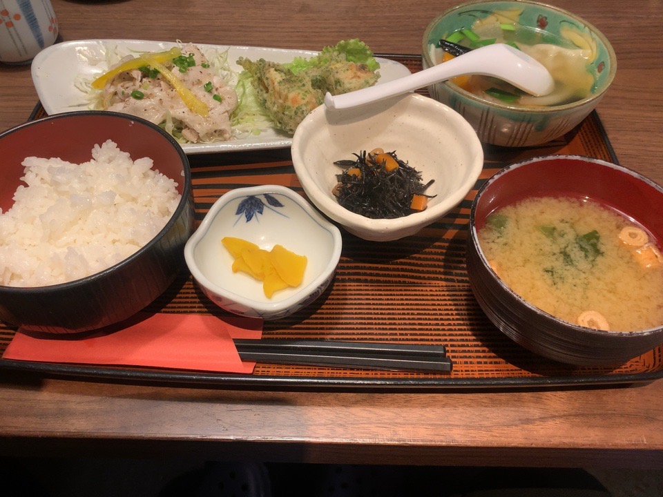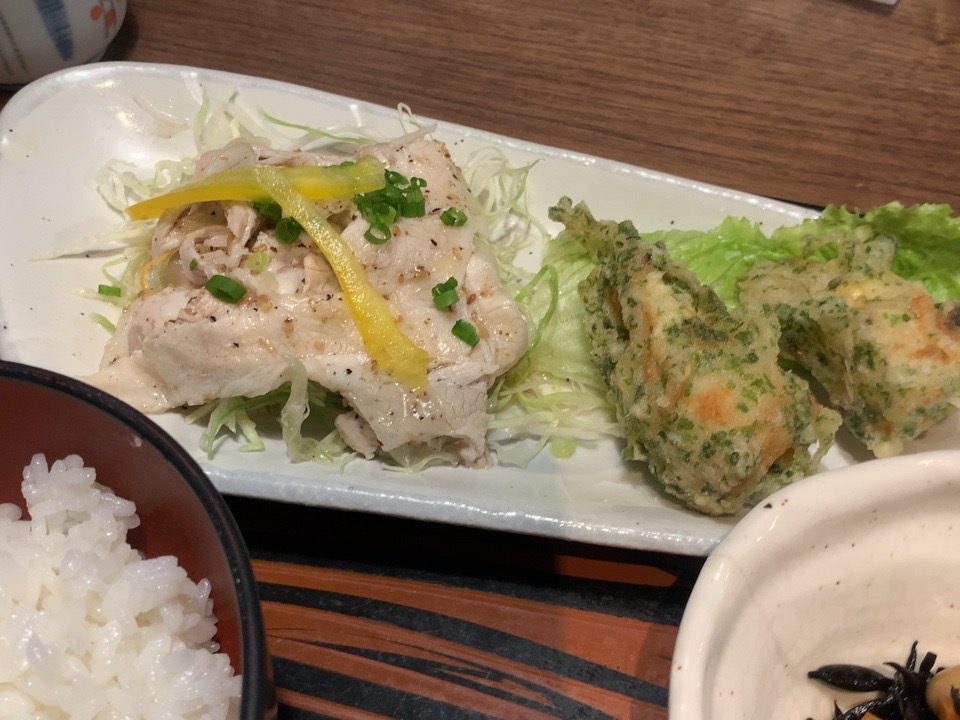 豚しゃぶとちくわのチーズ揚げに水餃子、小鉢もついています。