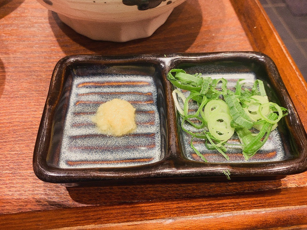 生姜とネギの薬味は食べる前にうどんにつけて食べるのがおすすめ。
