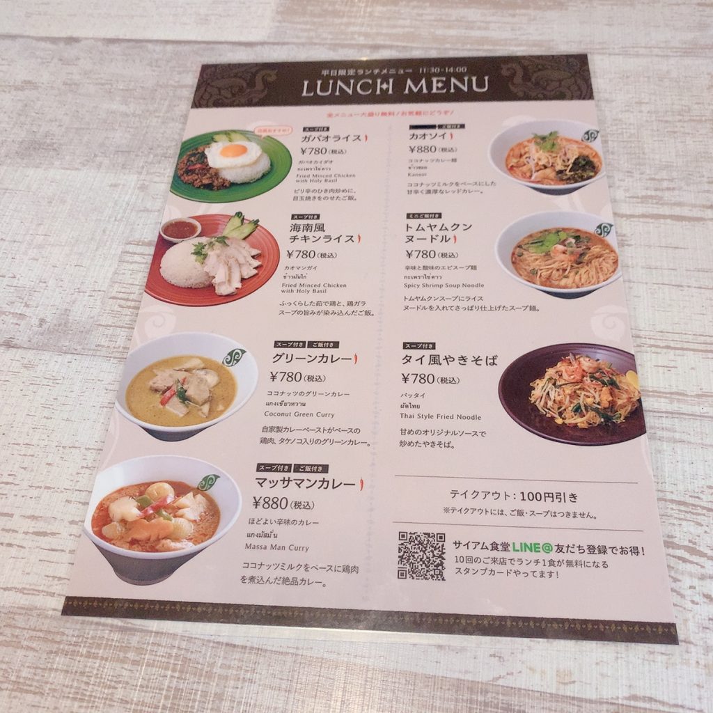 ランチメニューはガパオライスをはじめ、タイの代表的な海南風チキンライスやグリーンカレーなど7種類から選択できます。