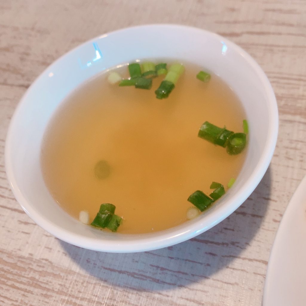 セットについてくるスープは少しうすあじで、ごはんの食欲を抑えてくれるので食べすぎ防止になります。